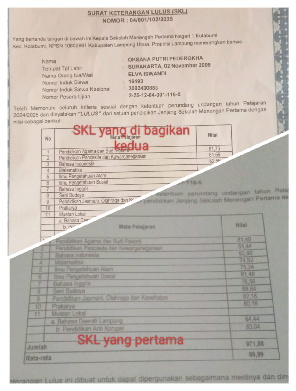 Pasalnya salah seorang murid kelas 9 yang bernama OS”iya pada saat saya menerima surat keterangan lulus (SKL). Dari sekolah. Pada hari itu pembagian surat keterangan lulus. Yang dibagikan oleh guru di sekolah pada jam 15.00 waktu Indonesia Barat. Pada saat itu saya menerima surat keterangan lulus sekolah. Ada beberapa nilai saya yang bernilai rata-rata 80, sekian. Dan ada pula yang nilainya 70, sekian. Pada saat saya meminta fotocopy legalisir di sekolahan ada salah satu guru yang mengatakan kalau nilai saya ada yang salah.