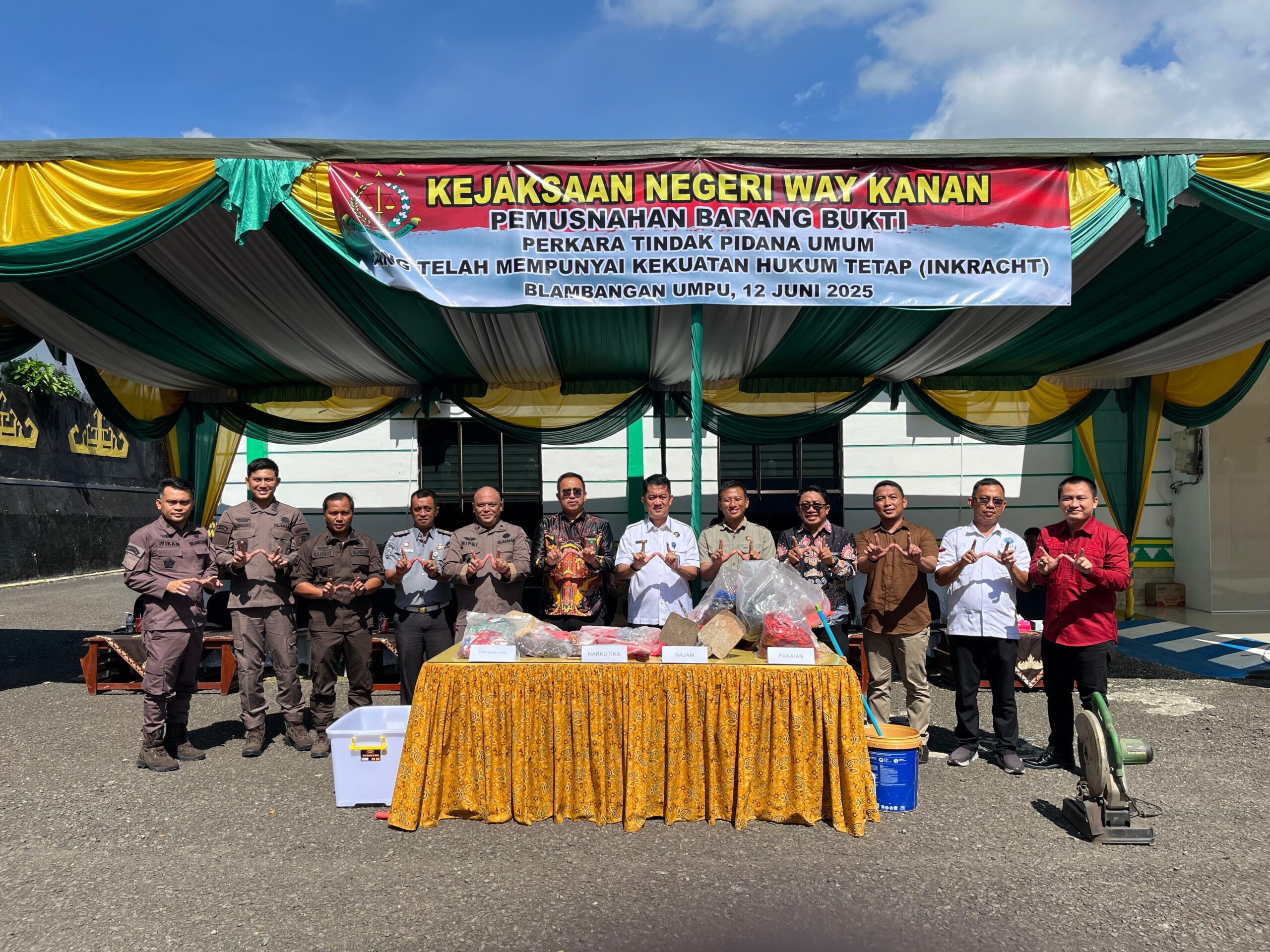 Way kanan (PI) Ketua DPC Y-GANN Way Kanan Habibi Fawaz apresiasi langkah kejaksaan negeri Way Kanan dalam melaksanakan kegiatan pemusnahan barang bukti (BB) Tindak Pidana Umum Yang Telah Mempunyai Hukum Tetap (Incracht) di Halaman Kantor Kejaksaan Negeri setempat, kamis (12/06/2025).