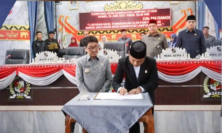 Rapat berlangsung di Ruang Sidang DPRD Kabupaten Lampung Utara, Kamis (26/6/2025), dan dipimpin oleh Dedi Andriyanto selaku perwakilan Ketua DPRD. Turut hadir Wakil Ketua DPRD, Cerli Yusrizal dan Wansori, serta 35 dari total 45 anggota DPRD.