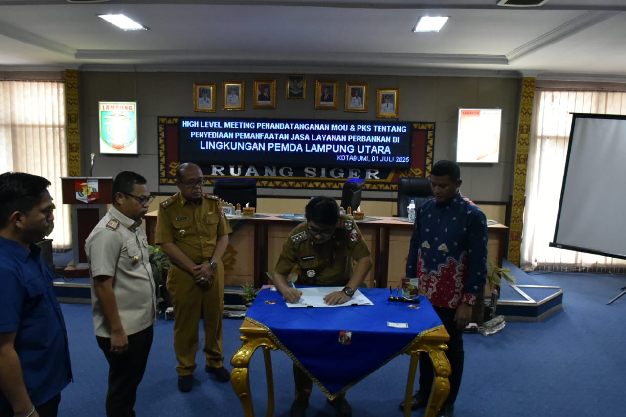 Lampung Utara,(PI) 1 Juli 2025 – Pemerintah Kabupaten Lampung Utara terus menunjukkan komitmennya dalam mendorong transformasi digital di sektor pelayanan publik. Hari ini, Bupati Lampung Utara, Dr. Ir. Hamartoni Ahadis, M.Si., secara resmi menandatangani Nota Kesepahaman (MoU) dan Perjanjian Kerja Sama (PKS) dengan PT Bank Mandiri (Persero) Tbk, dalam rangka penyediaan dan pemanfaatan layanan perbankan berbasis digital di lingkungan Pemerintah Daerah.