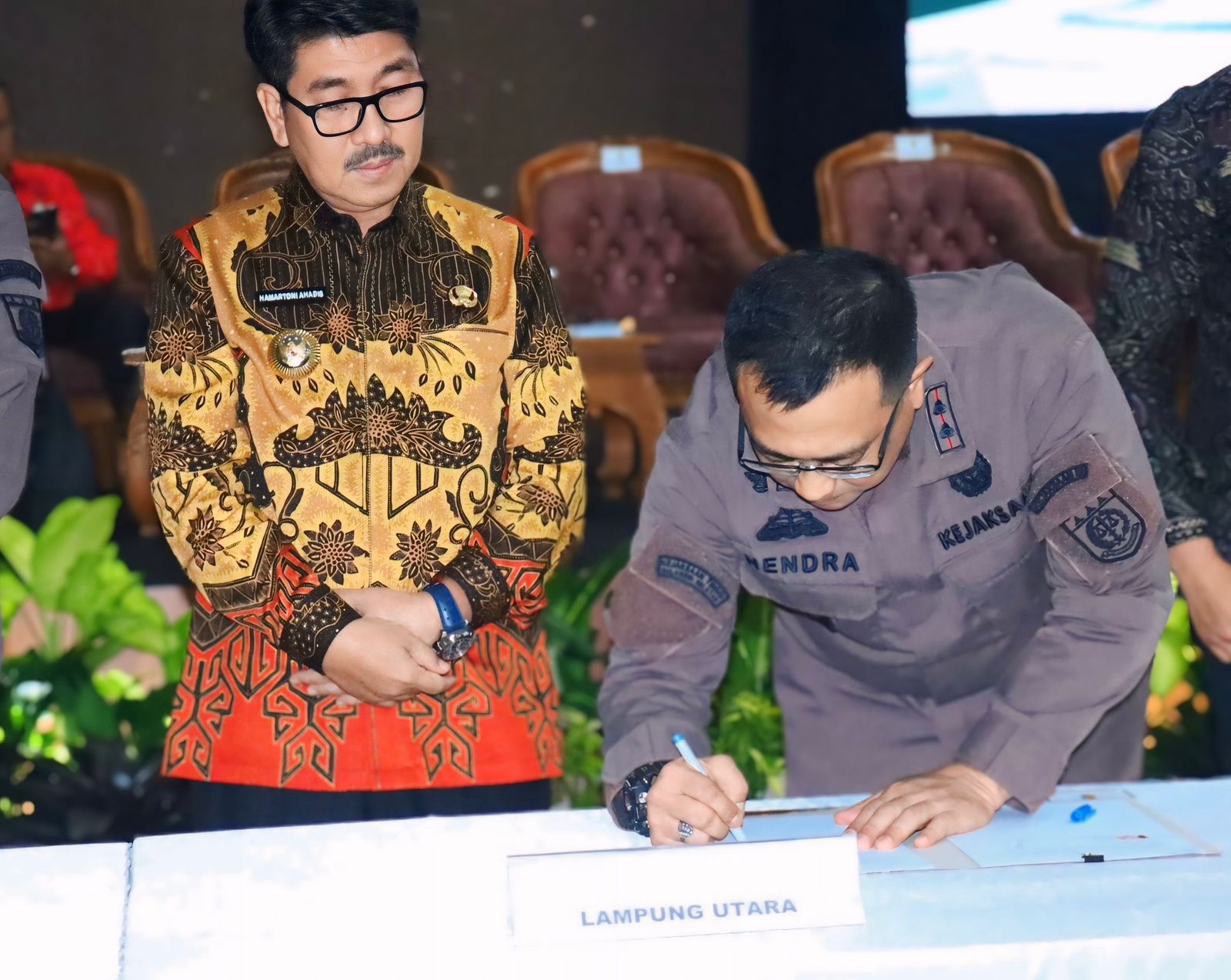 Metro, (HP) 14 Agustus 2025 – Bupati Lampung Utara, Dr. Ir. Hamartoni Ahadis, M.Si., bersama Kepala Kejaksaan Negeri Lampung Utara, Hendra Syarbaini, S.H., M.H., menghadiri sekaligus menandatangani Perjanjian Kerja Sama Sinergitas Pelaksanaan Tugas dan Fungsi Pengelolaan Keuangan Desa antara bupati/wali kota dan kepala kejaksaan negeri se-Provinsi Lampung, di Kota Metro, Kamis (14/8/2025).