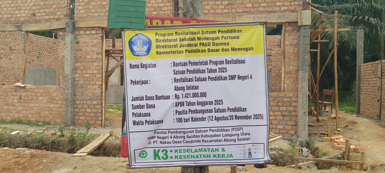 Lampung utara (HP) — Program revitalisasi satuan pendidikan direktorat sekolah menengah pertama direktorat jendral PAUD Dasmen kementrian pendidikan dasar dan menengah, Nama kegiatan: Bantuan pemerintah program revitalisasi satuan pendidikan tahun 2025, Pekerjaan Revitalisasai Satuan Pendidikan SMPN 4 Abung Selatan, Jumlah Dana Bantuan : RP.1.421.000.000,- .Sumber Dana Bantuan : APBN Tahun Anggran 2025.Pelaksana: Panitia Pembangunan Satuan Pendidikan, Waktu Pelaksana: 100 Hari Kalender (12 Agustus/20 Nopember 2025} Diduga dikorupsi Berjamaah. (10/09/2025.).