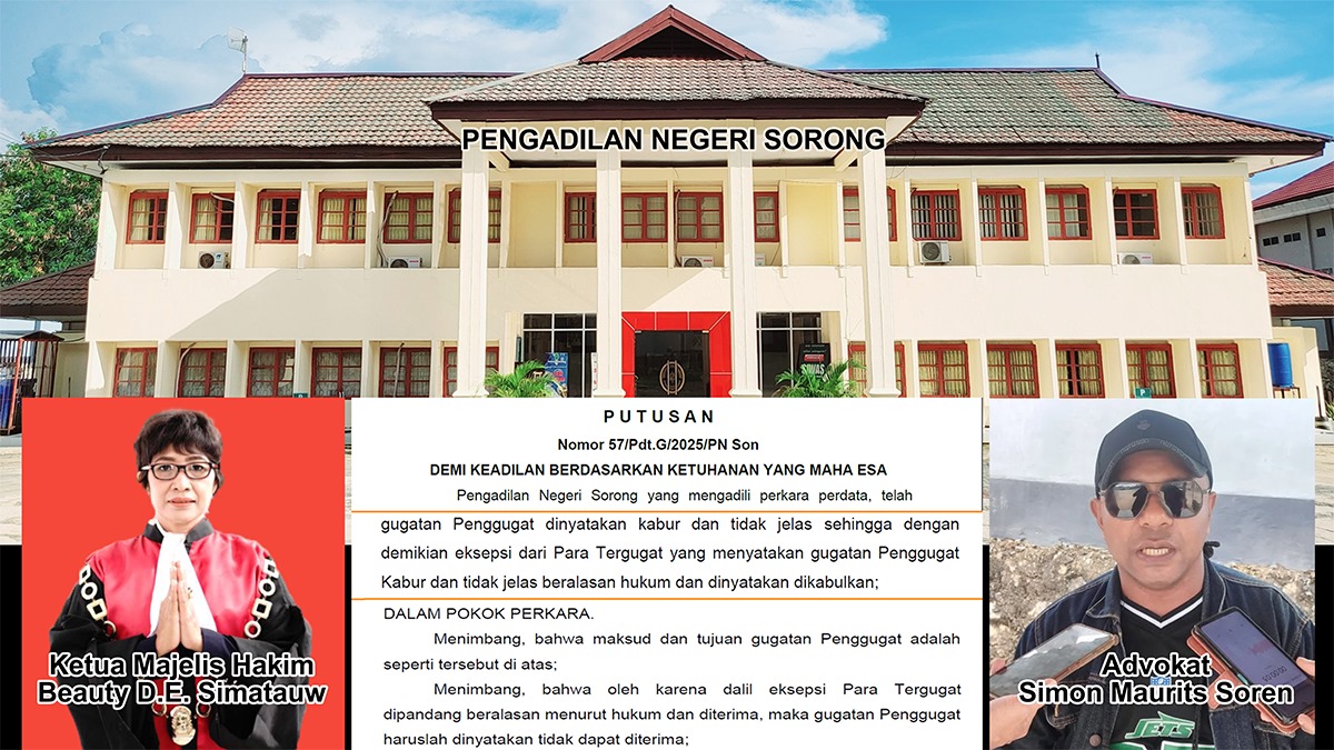 Hal itu disampaikan ketua Tim Pengacara tergugat, Advokat Simon Maurits Soren, S.H., M.H., kepada media ini, Senin, 22 September 2025. Setelah melalui proses persidangan panjang di PN Sorong, akhirnya Majelis Hakim memutuskan menerima eksepsi tergugat dan menolak dengan tegas gugatan pihak penggugat.