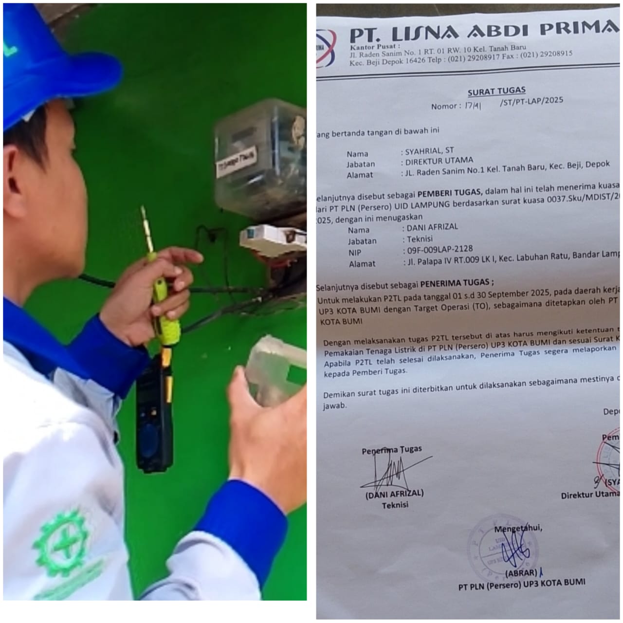 ‎Kemudian kedua petugas tersebut menyodorkan surat perintah tugas dari Direktur PT Lisna Abdi prima,PT PLN (Persero) ABRAR UP3 Kotabumi tidak