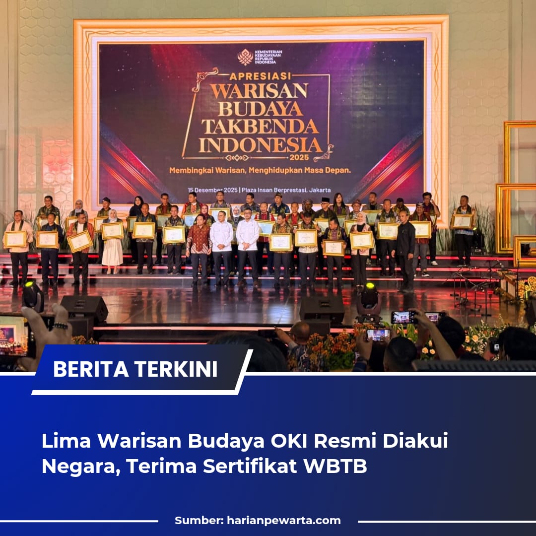 Jakarta ((HP)) – Pemerintah Kabupaten Ogan Komering Ilir menerima lima sertifikat Warisan Budaya Tak Benda (WBTB) dari Kementerian Kebudayaan Republik Indonesia, sekaligus menambah daftar warisan budaya OKI yang telah diakui secara nasional.