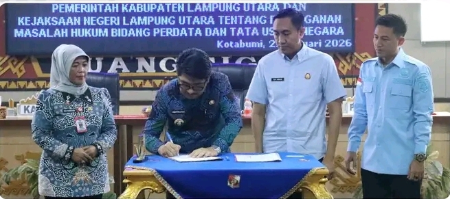 Penandatanganan berlangsung di ruang Siger, Kamis 22 Januari 2026 dan dilakukan langsung oleh Bupati Lampung Utara Dr. Ir. Hamartoni Ahandis, M.Si., bersama Kepala Kejaksaan Negeri Lampung Utara Edy Subhan, S.H., M.H.