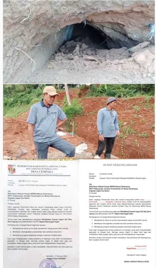 Rencana pembohongan publik terbongkar pada siang hari ini, media ini sontak kaget setelah mendapati pernyataan Kepala Desa Cempaka bernama Rizki Puspa Dewi, yang menyampaikan aspirasinya bersama pihak Balai Besar Wilayah Sungai (BBWS) Mesuji Sekampung SNVT Pelaksanaan Jaringan Pemanfaatan Air Mesuji Sekampung pada Kegiatan Irigasi dan Rawa I. Dengan nomor 470 /38/01/53-LU/2025 – tanggal 5 Febuari 2026.
