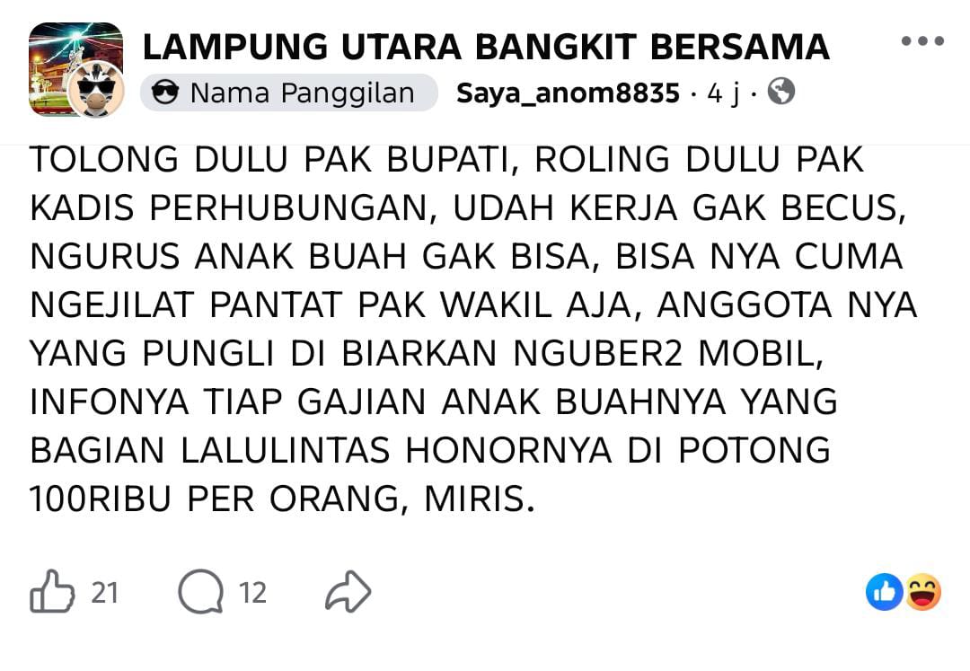 Lampung Utara (PI) – Desakan untuk melakukan “rolling” atau mutasi jabatan terhadap Kepala Dinas Perhubungan (Kadishub) Lampung Utara semakin menguat di kalangan warganet. Tuntutan ini muncul setelah adanya keluhan mengenai kinerja Kadishub yang dinilai tidak becus dan tidak mampu mengurus anak buahnya.