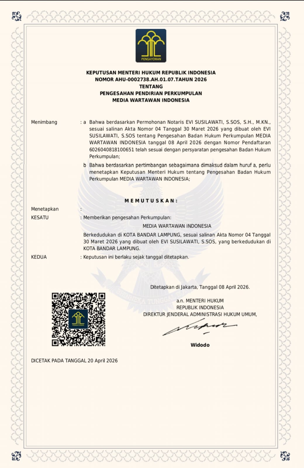 Pengesahan pendirian MWI telah ditetapkan melalui Keputusan Menteri Hukum Republik Indonesia Nomor AHU-0002738.AH.01.07.Tahun 2026, sebagai bentuk legalitas dan pengakuan resmi atas keberadaan organisasi ini.